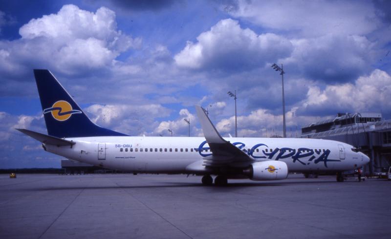 Boeing 737 - 800 der Euro Cypria (mit dunkelblauem Leitwerk) in München.