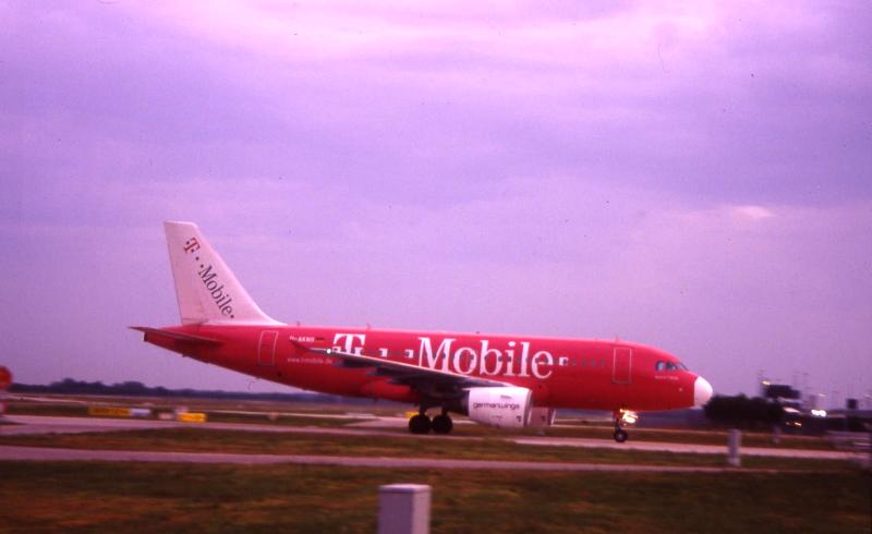 macht auf einem ihrer Airbus A 319 Werbung für T - Mobile. Hier die
