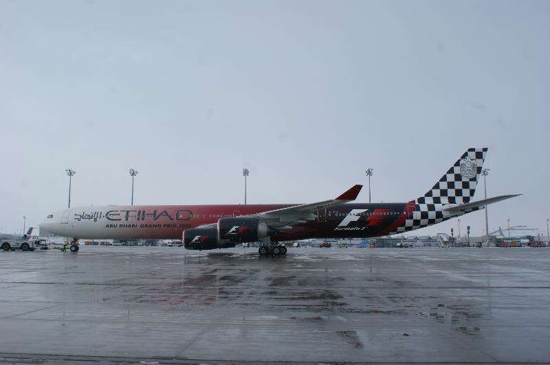 Airbus A 340 - 600 in "Formel 1" Bemalung. Leider hat das Wetter