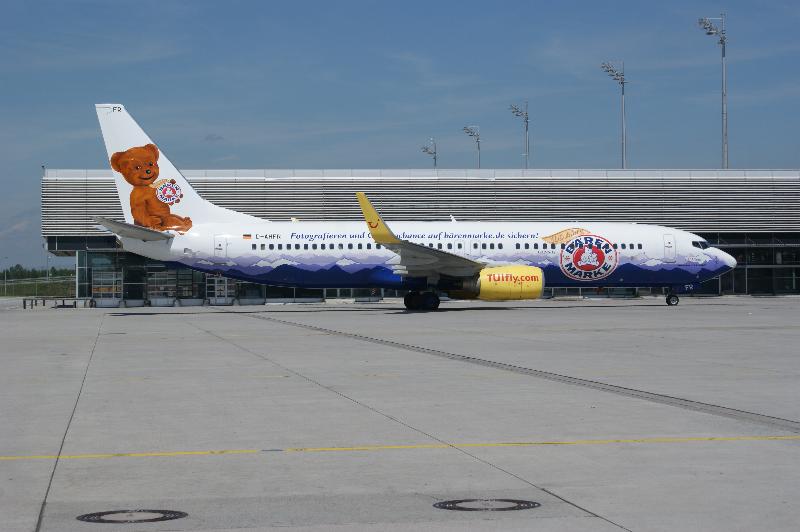 hat eine Boeing 737 - 800 (D-AHFR) mit einer "Bärenmarke"
