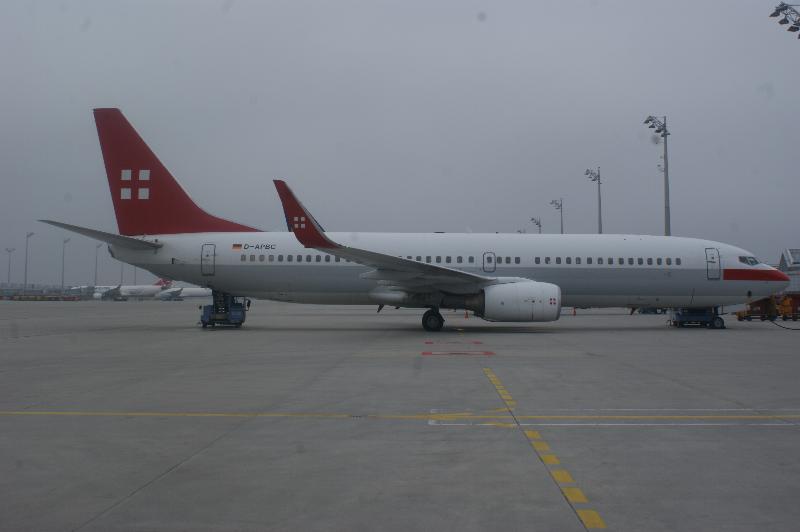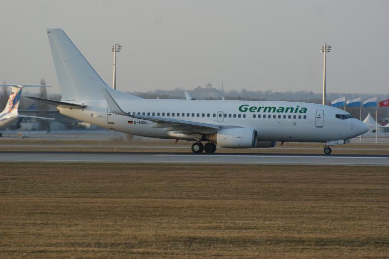 Boeing 737 - 700 der Germania trägt noch keine Bemalung im Leitwerk.