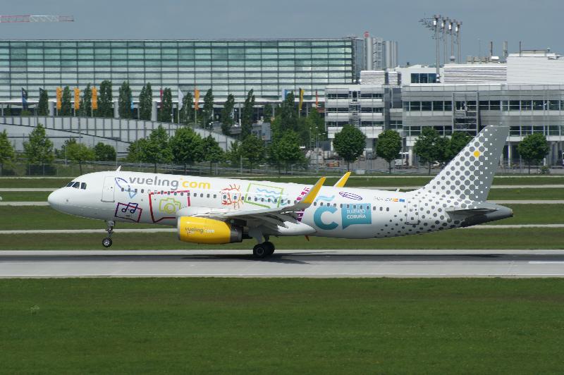 bunt bemalt war dieser Airbus A 320 mit Sharklets der Vueling, der München