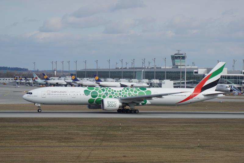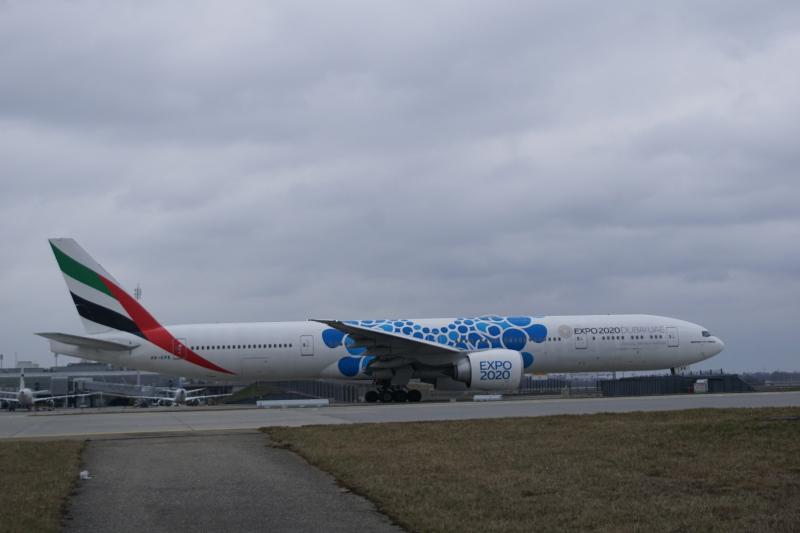 EXPO 2020 Variante der Boeing 777 der Emirates war am 01.04.2018 in München
