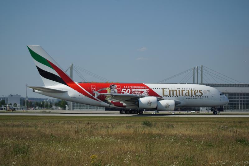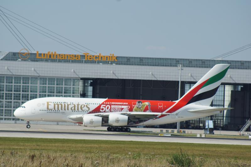 Airbus A 380 in "Dubai Rugby" Bemalung, linke Seite |