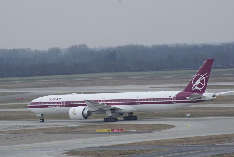 diese Boeing 777 - 300 der Qatar Airways in Retro - Bemalung nach