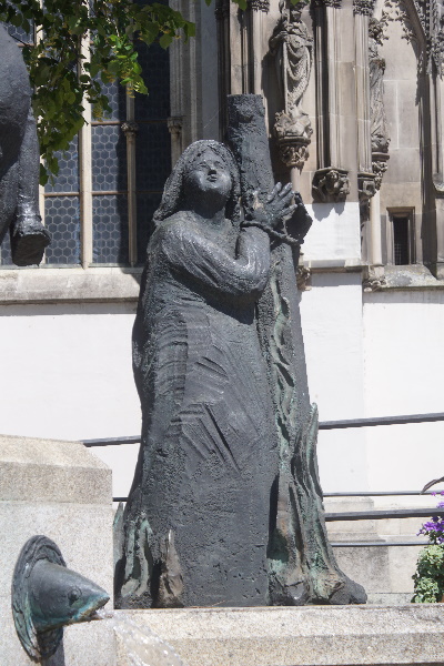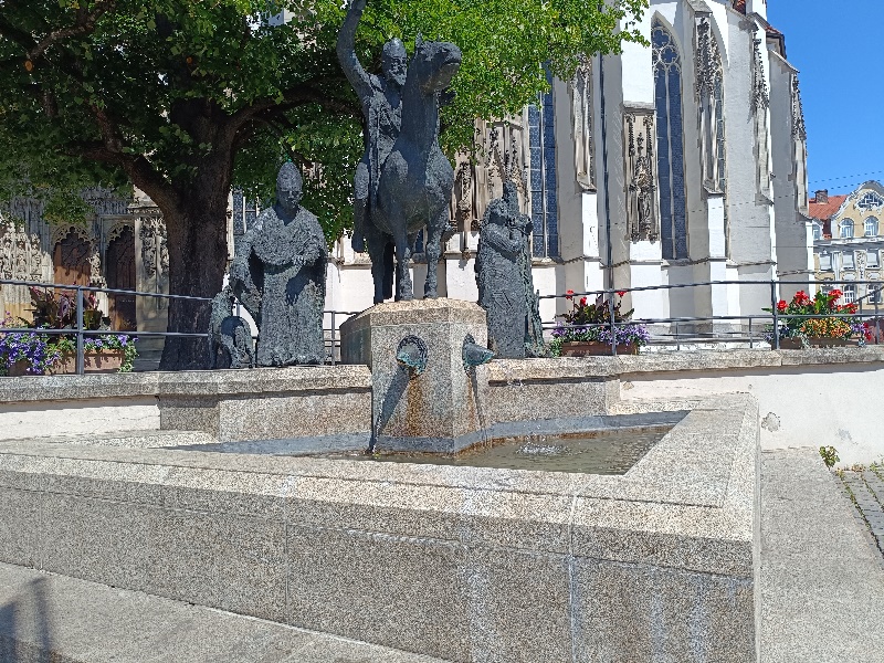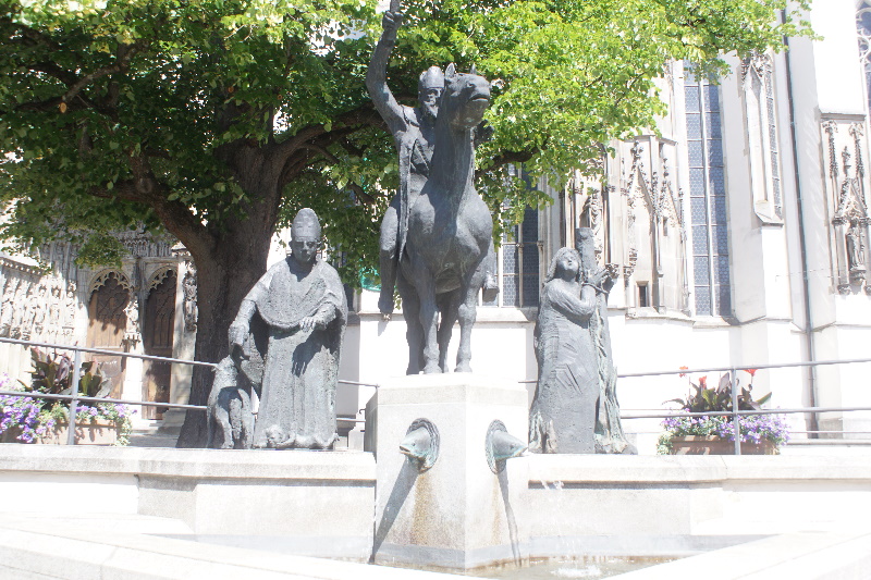 Domplatzes. Die drei auf dem Brunnen gezeigten Bistumspatrone haben alle