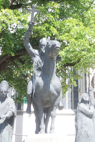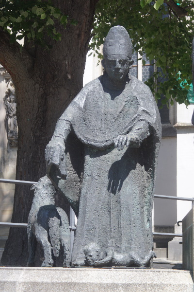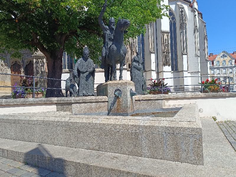 vor dem Augsburger Dom zeigt die drei Bistumspatrone Bischof Ulrich, die