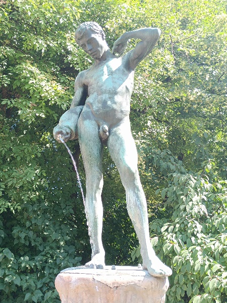 Diese Figur, ein nackter Jüngling mit Gartenschlauch, steht auf dem
