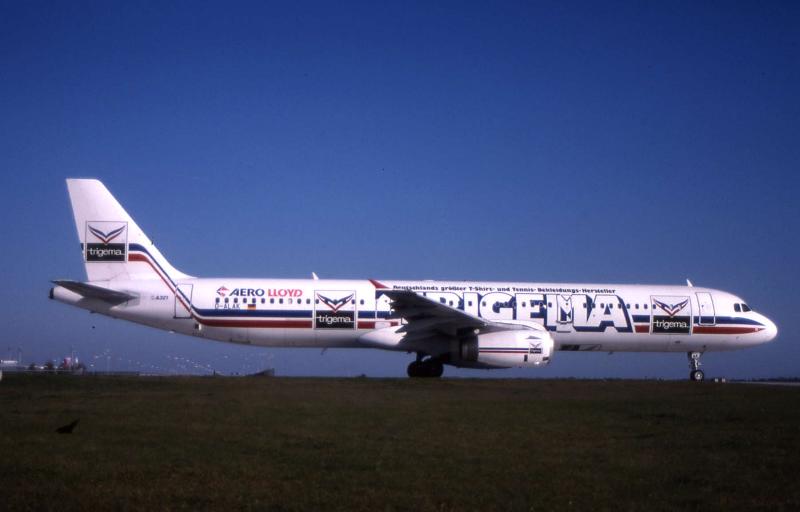 Airbus A 321 der Aero Lloyd mit einer Werbeaufschrift für den Sportartikelhersteller