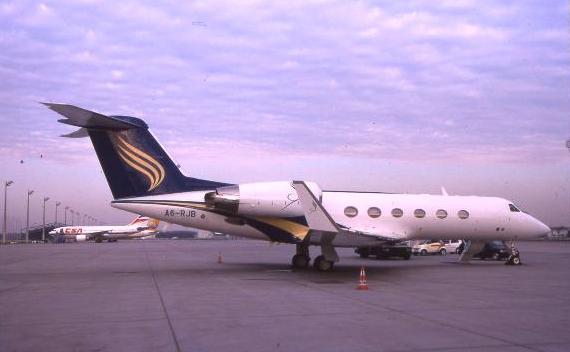 eine Gulfstream III (mit Titel "Here comes Pia" unter dem Cockpitfenster)