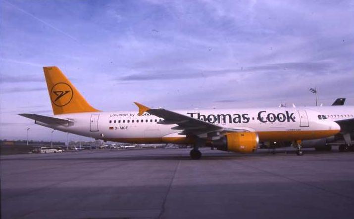 Thomas Cook in München. Er trägt noch das Leitwerkszeichen des