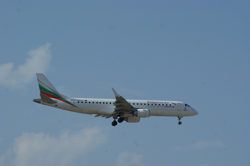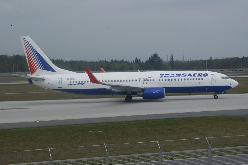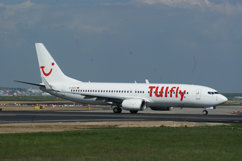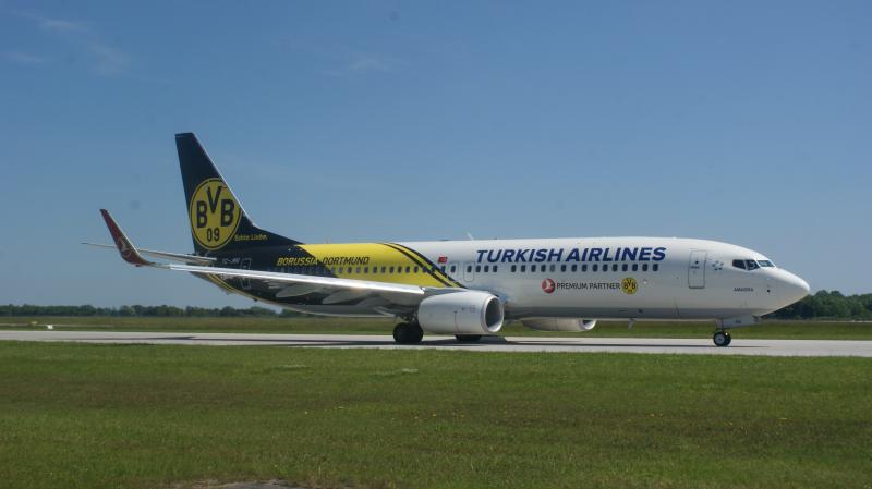 eine Boeing 737 - 800 mit BVB Farben versehen. Hier auf dem Weg zur Südbahn