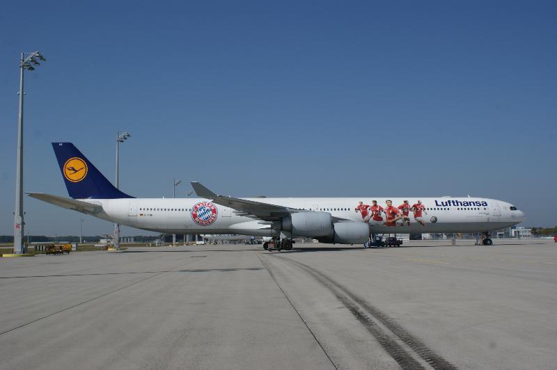 hat einen Airbus A 340 - 600 mit FC Bayern Stickern versehen. Hier die