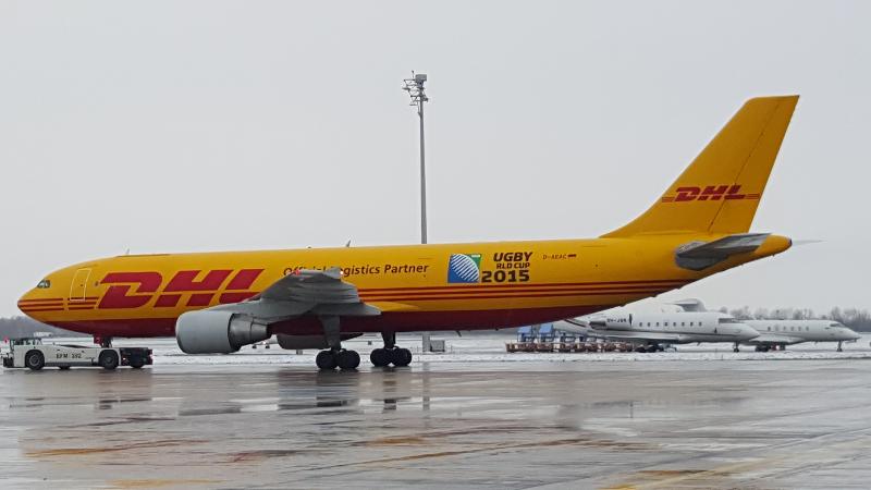 Airbus A 300 - 600 der DHL sind noch Überreste des Stickers "Rugby