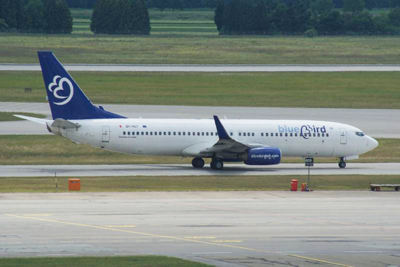 Boeing 737 - 800 in München. Hier eine Maschine mit hellblauem Leitwerk. |