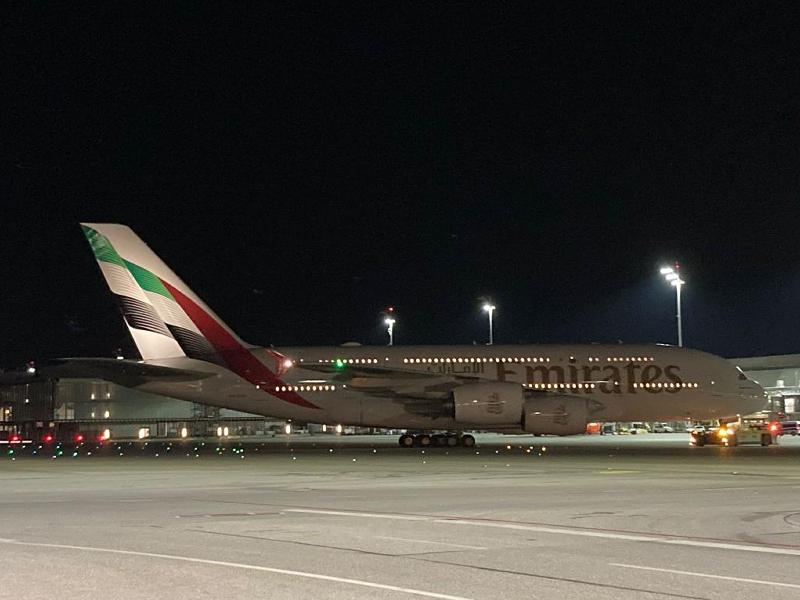 Airbus A 380 der Emirates mit dem neuen Leitwerksdesign auf dem Abendflug