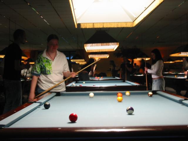 seiner Farbe auf dem Tisch hat. Es gibt noch einige Punkte mehr, aber für ein Beispiel muss das hier reichen. Wenn ein Spieler ein Foul begangen hat, darf sich der andere Spieler die weiße Kugel nehmen und an einem beliebigen Ort auf dem Tisch platzieren, um seinen "Freistoß" auszuführen. Ein Spieler ist so lange an der Reihe, bis er keine Kugel seiner Farbe mehr versenkt. Wenn zwei Kugeln von unterschiedlicher Farbe gleichzeitig fallen, zählt die Kugel, die zuerst gefallen ist. War es eine eigene, darf man weiterspielen. War es eine gegnerische, darf der Gegner den nächsten Stoß ausführen. Das Spiel ist gewonnen, wenn die schwarze 8 korrekt in einem Loch versenkt wurde; doch Vorsicht: Sollte die weiße Kugel VOR der schwarzen 8 fallen, hat man verloren! Um das Spielen etwas leichter zu machen, gibt es auch Hilfsmittel. Wenn die weiße Kugel z.B. so weit weg liegt, dass man Mühe hat, sie mit dem Queue zu erreichen, gibt es eine Verlängerung für den Queue. Man kann es jederzeit ohne Einwände des Gegners benützen. Auf einigen der Bilder in der Fotogalerie ist so ein Hilfsmittel zu sehen. Auch gibt es eine Kreide, die die Haftung der Queuespitze, "Pomeranze" genannt, auf der weißen Kugel etwas verbessern sollte und der Queue nicht abrutscht. Das wäre dann ein Foul. Also lieber etwas mehr Kreide verwenden, dafür aber um so seltener abrutschen! Man muss ja seinem Gegner die "Freistöße" nicht unbedingt auf dem Silbertablett servieren! Man
